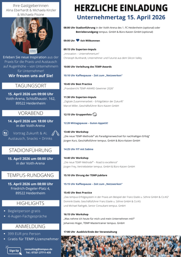 „Aus der Praxis für die Praxis“ lautet unser Motto und genau das finden Sie bei unserem Unternehmertag! Dort, wo sich zahlreiche Unternehmenspreisgewinner „die Hand schütteln“ und Sie die neusten Updates der TEMP-Methode®, sowie einen Erfahrungsaustausch unter Experten erleben.
